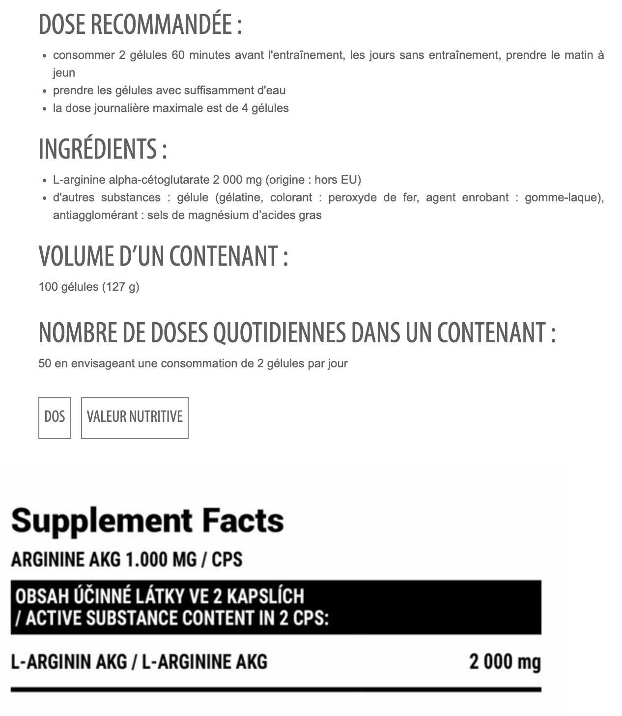 1 000 mg d’Arginine AKG par capsule – dosage précis