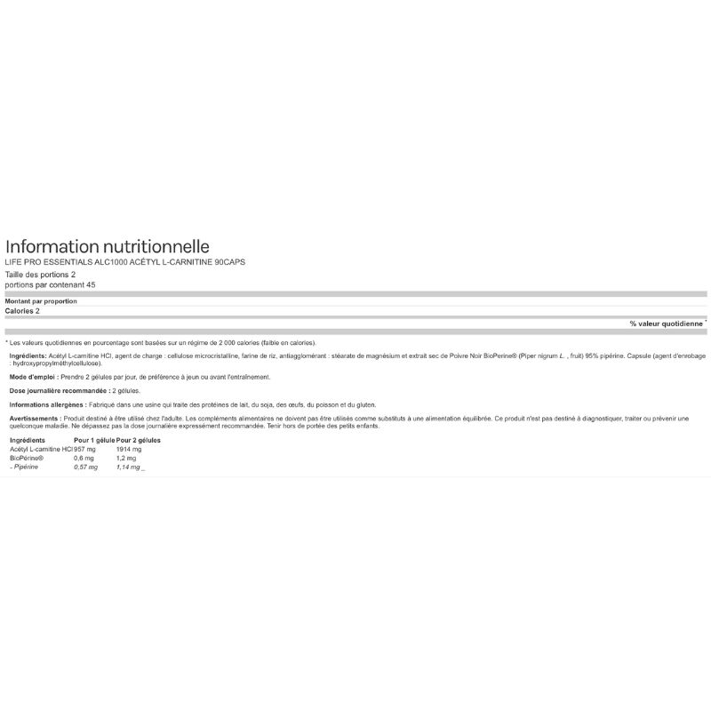 Life Pro Essentials ALC1000 Acetyl L-Carnitine est un supplément spécialement conçu pour augmenter la quantité de graisse que le corps est capable d'éliminer naturellement. De plus, sa formule de carnitine cherche à améliorer sa capacité d'absorption pour une plus grande efficacité. Ce supplément Life Pro contient une nouvelle formulation de carnitine, qui apparaît sous sa forme "ester" . Ainsi, on tente d’améliorer la facilité avec laquelle cette substance est absorbée par l’organisme, dans le but ultime d’ augmenter son efficacité.