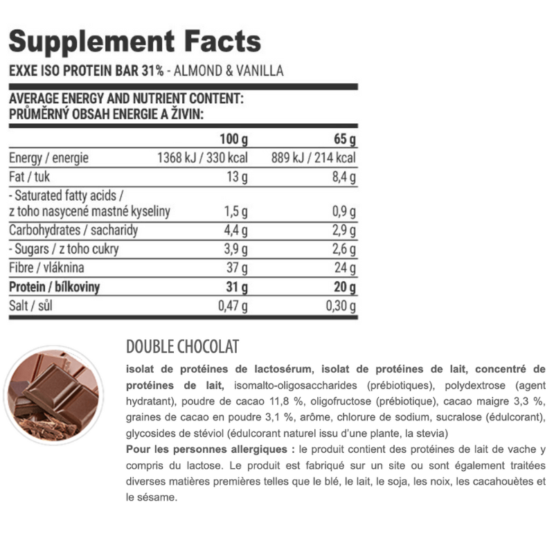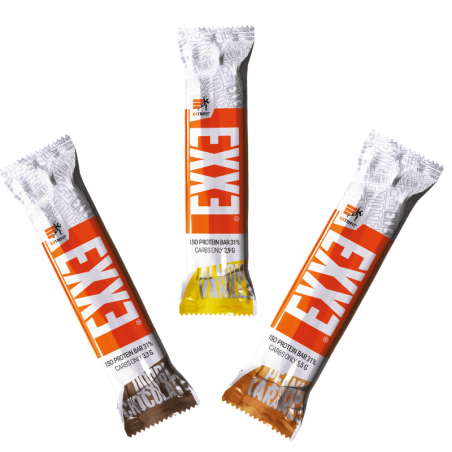 Chaque barre protéinée Extrifit® EXXE® contient 20 grammes des meilleures protéines qui soient ! Et les graisses ? Moins que dans un cocktail de protéines destiné au régime : seulement 5 à 7 grammes ! Quant aux glucides, nous sommes parvenus à les réduire à tel point que les barres EXXE® peuvent être consommées pendant un régime strict ! Les sucres ne s’élèvent qu’à 2,1 - 4 g par barre ! On peut affirmer sans exagérer que les barres protéinées Extrifit® EXXE® sont de loin les meilleures disponibles sur le marché.