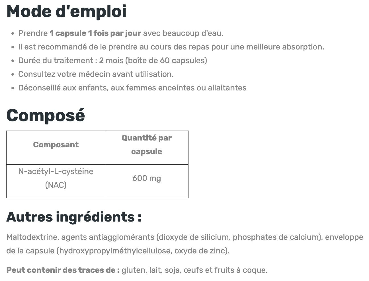 Prendre 1 comprimé par jour avec un verre d’eau, de préférence au cours d’un repas pour une meilleure tolérance. Cette dose apporte 600 mg de NAC — une quantité couramment utilisée dans les compléments alimentaires pour soutenir l’équilibre antioxydant et la détoxification.