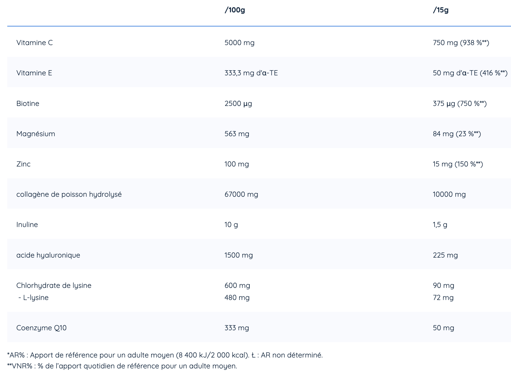 Mélanger 1 dose de 15 g (environ une cuillère) dans 250 à 300 ml d’eau fraîche. À consommer de préférence le matin, à jeun ou en dehors des repas, pour une meilleure assimilation.