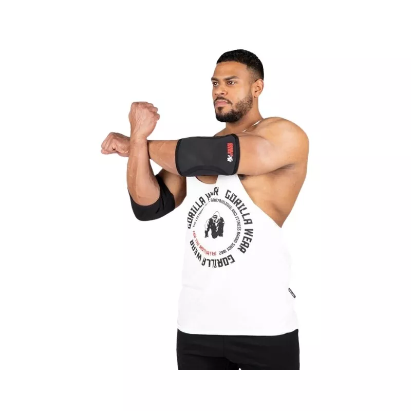 Enfilez les Elbow Sleeves Gorilla Wear juste avant votre séance, de préférence lors des exercices de poussée (développé couché, dips, overhead press…). Ajustez-les correctement pour qu’elles couvrent l’ensemble de l’articulation du coude, sans pli ni tension excessive.