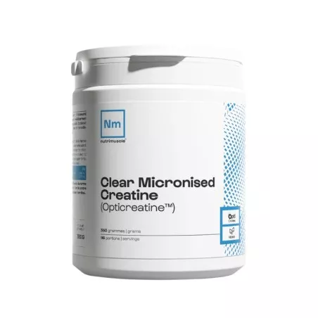 La créatine micronisée Opticréatine™ de Nutrimuscle est une version optimisée de la créatine monohydrate, conçue pour offrir une meilleure solubilité, une absorption rapide et un confort d’utilisation amélioré. Grâce à sa micronisation avancée, elle se mélange plus facilement et limite les dépôts dans le shaker.