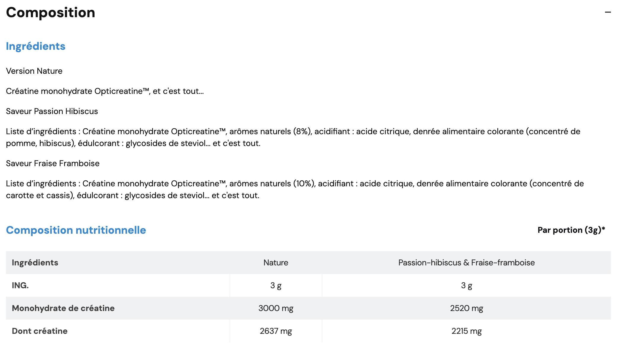 Composée à 100 % de créatine pure, rien n'a été ajouté ou enlevé lors de la production