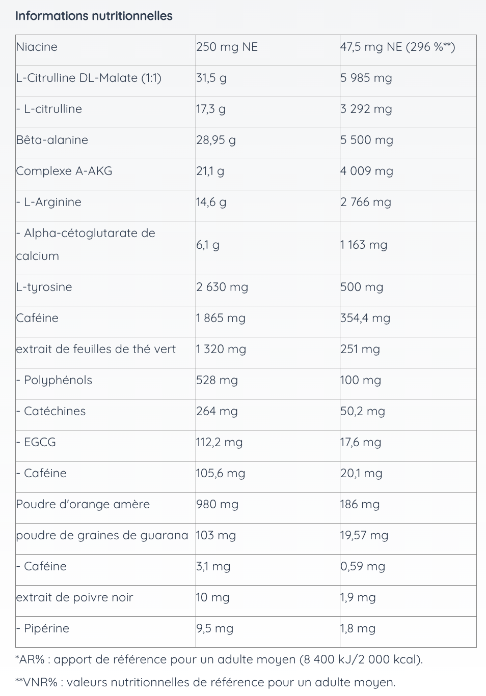 350 mg de caféine + 5,5 g de bêta-alanine + 5,9 g de citrulline, L-thyrosine