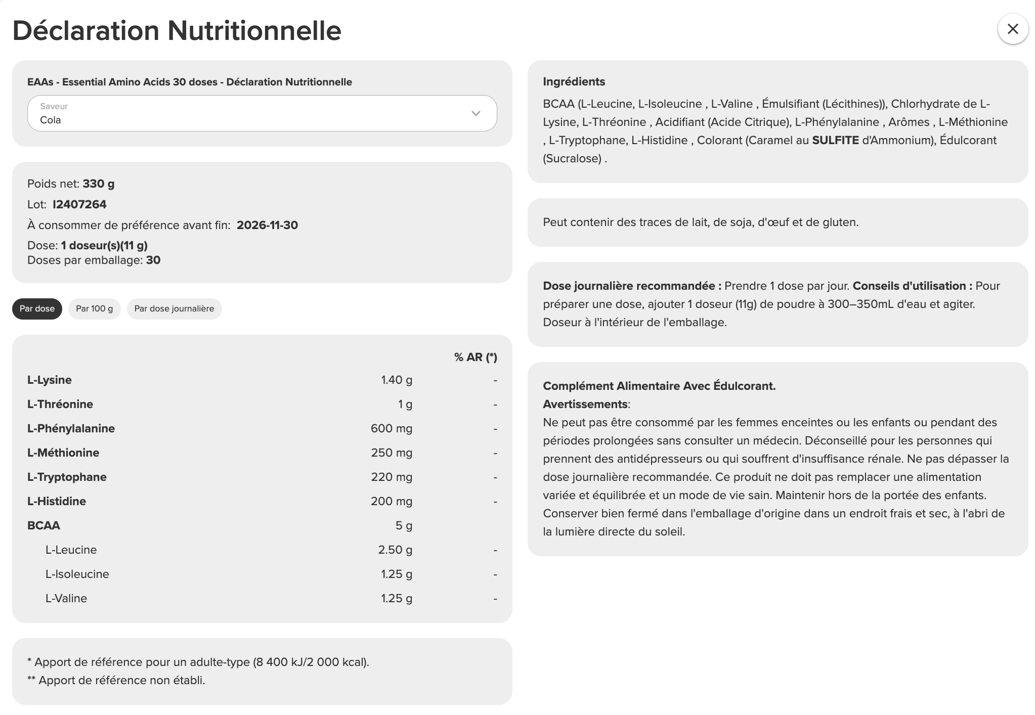 Type de produit : Acides aminés essentiels (poudre aromatisée)