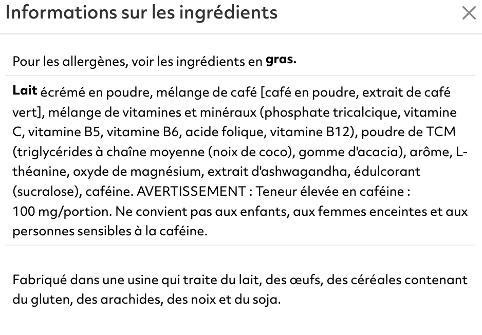 Tenir hors de portée des enfants. Déconseillé aux femmes enceintes, allaitantes ou aux personnes sensibles à la caféine.