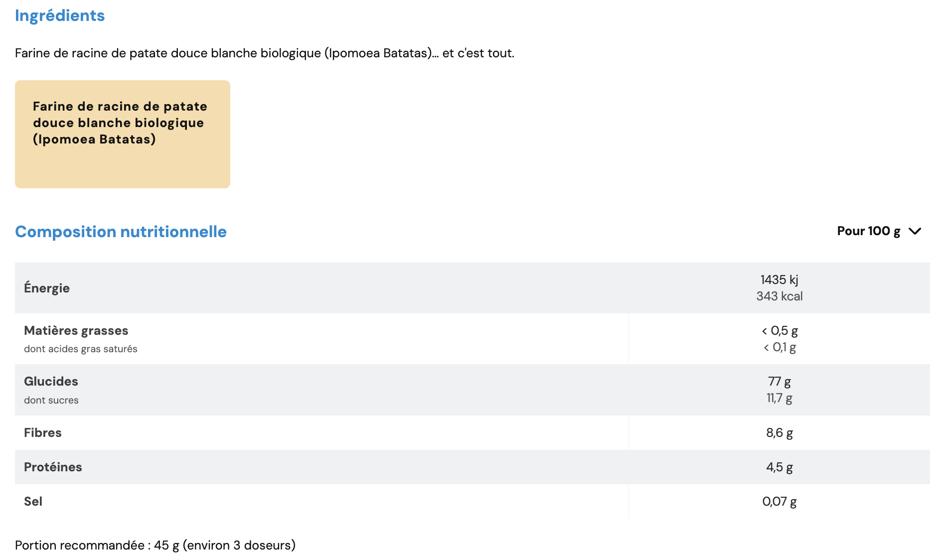 Utiliser la farine de patate douce en remplacement de votre farine classique dans vos recettes (gâteaux, pancakes, biscuits, etc.). Vous pouvez également diluer environ 45 g dans une boisson ou un shaker pour un apport énergétique rapide et pratique.