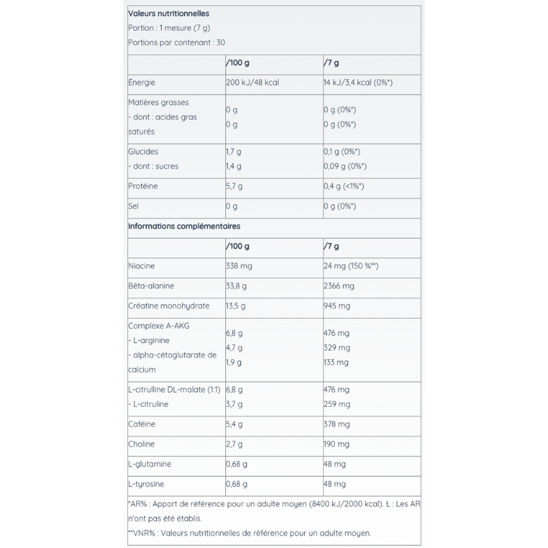 Formule complète avec caféine, bêta-alanine, créatine, citrulline, arginine et tyrosine