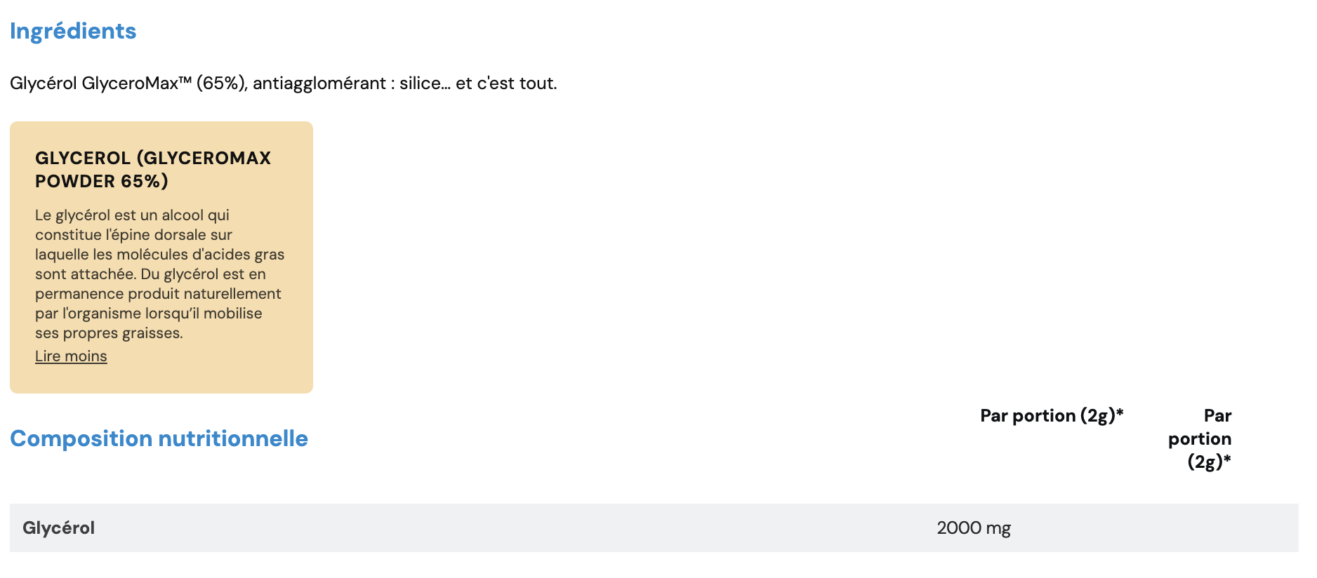 Avec une concentration de 65 % de glycérol pur, ce complément est idéal pour les athlètes souhaitant améliorer leur endurance, leur récupération ou encore réduire la sensation de fatigue due à la déshydratation.