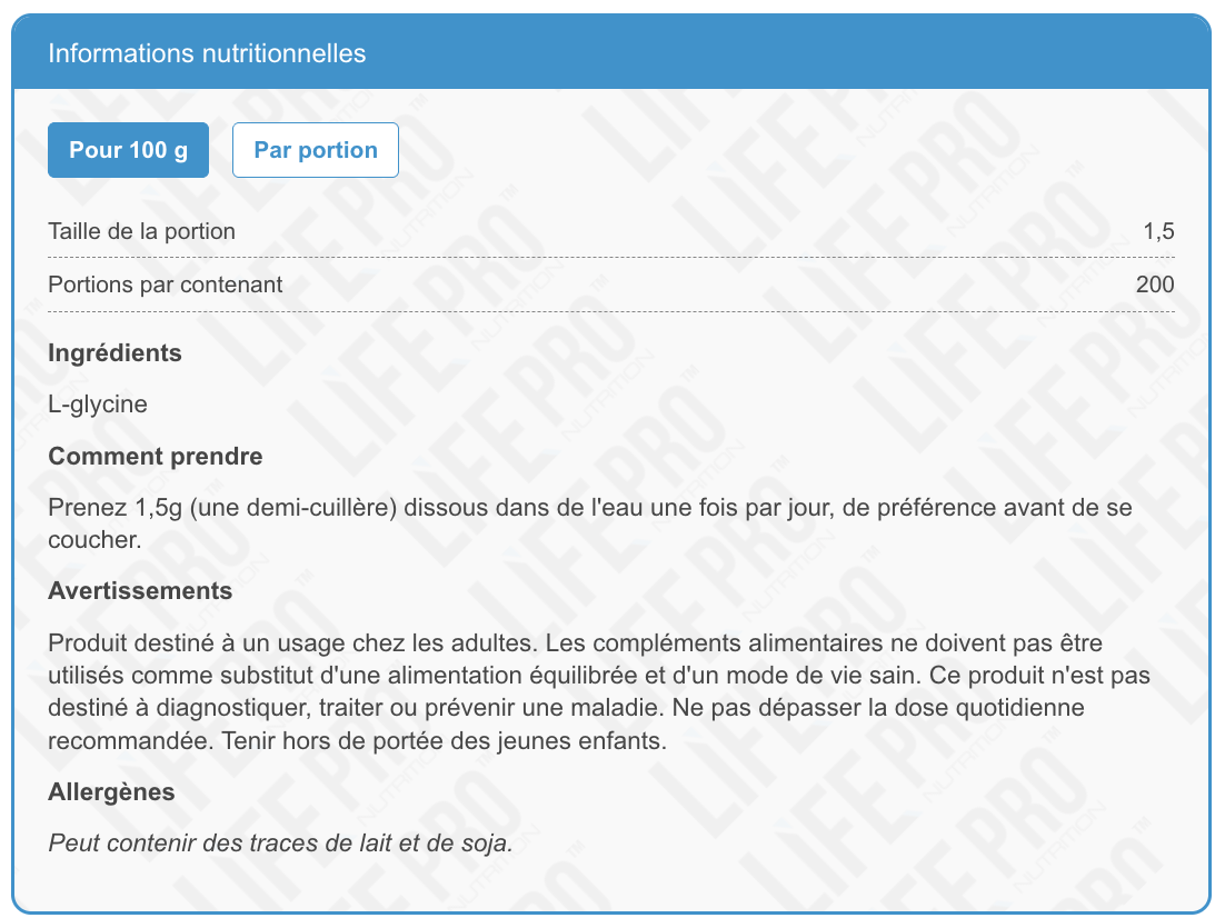 La Life Pro Glycine 300g est un supplément en poudre de glycine pure, un acide aminé non essentiel aux multiples fonctions physiologiques. Bien que l’organisme puisse le synthétiser, dans des contextes d’entraînement intense ou de charge métabolique élevée, un apport supplémentaire peut favoriser la récupération musculaire, le soutien des articulations, la synthèse du collagène et un sommeil de meilleure qualité.