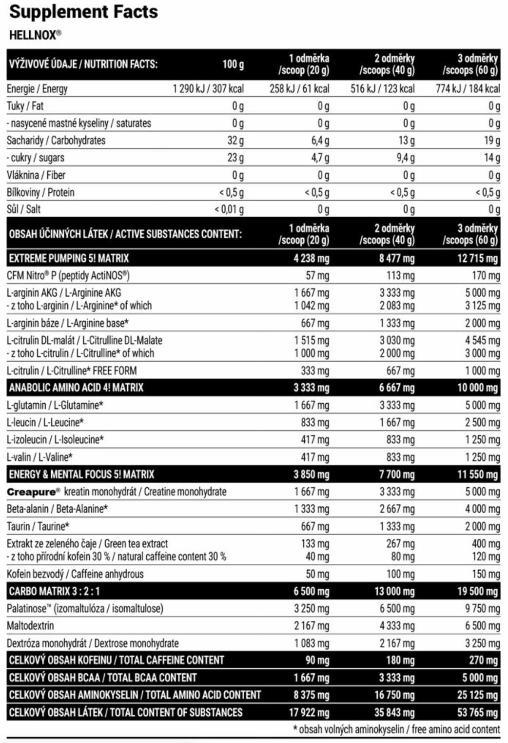 Avec ses 7,2 g de citrulline malate, 6 g d’arginine AKG, 2 g de bêta-alanine, et plus de 270 mg de caféine pour 3 doses, Hellnox est l’un des boosters les plus complets et puissants du marché. Il stimule efficacement la congestion musculaire, la force, améliore la concentration mentale et retarde la fatigue musculaire pendant l’effort.