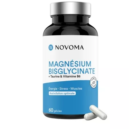 Pour vous aider à combler vos besoins en magnésium et profiter de ses nombreux bienfaits, ce complément est formulé à partir de magnésium bisglycinate, une forme hautement biodisponible de magnésium qui est facilement absorbée par l'organisme et qui ne cause pas d'inconforts digestifs. Chaque dose journalière de 3 gélules vous apporte 300mg de magnésium. Afin de renforcer son efficacité, notre magnésium bisglycinate est combiné à de la taurine et de la vitamine B6 bioactive qui favorisent l’assimilation du magnésium. Ce complément de magnésium chélaté est disponible en 2 versions : 60 gélules (programme de 20 jours) et 120 gélules (programme de 40 jours).