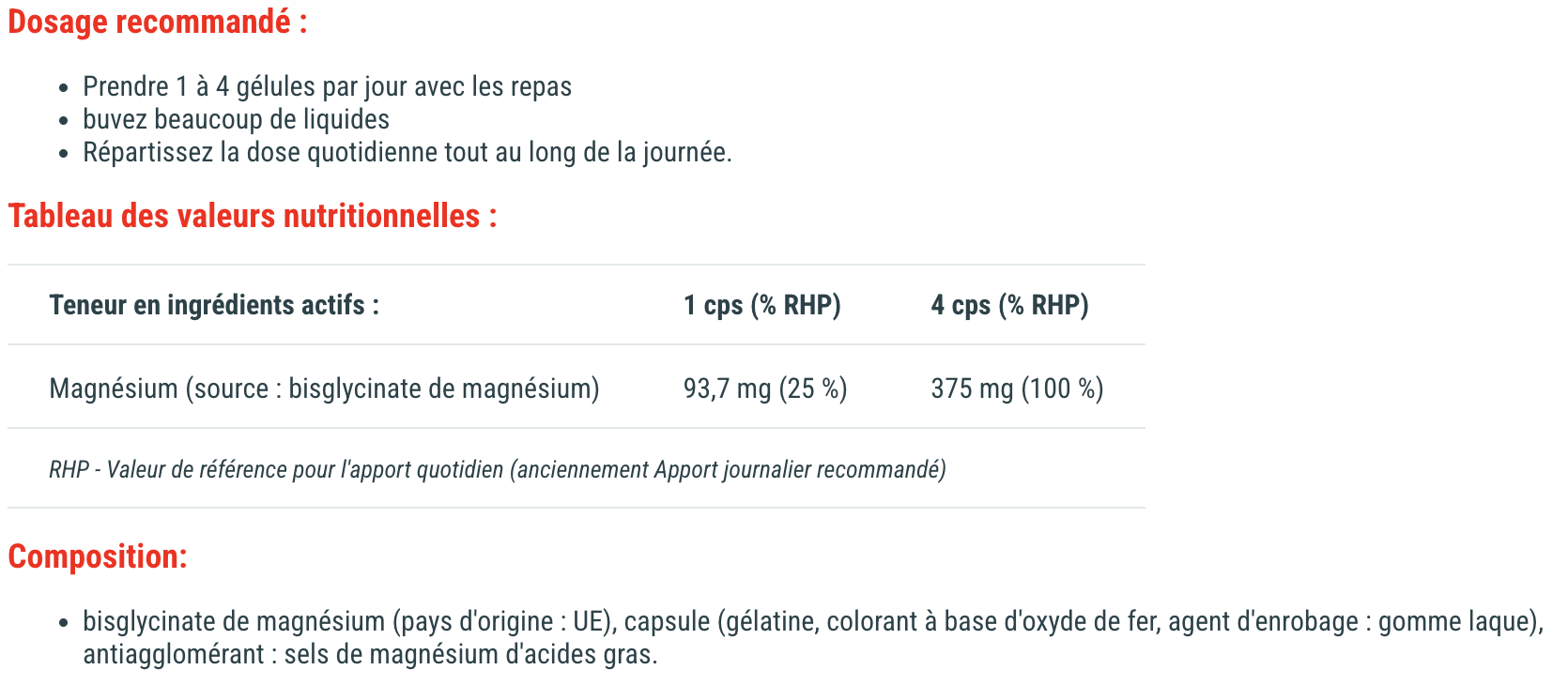 Chaque capsule apporte environ 94 mg de magnésium élémentaire, contribuant à la réduction de la fatigue et de l’épuisement, au maintien d’un métabolisme énergétique normal, à l’équilibre des électrolytes, au bon fonctionnement du système nerveux et à la fonction musculaire normale — des bénéfices particulièrement utiles après un entraînement intensif ou en période de récupération.