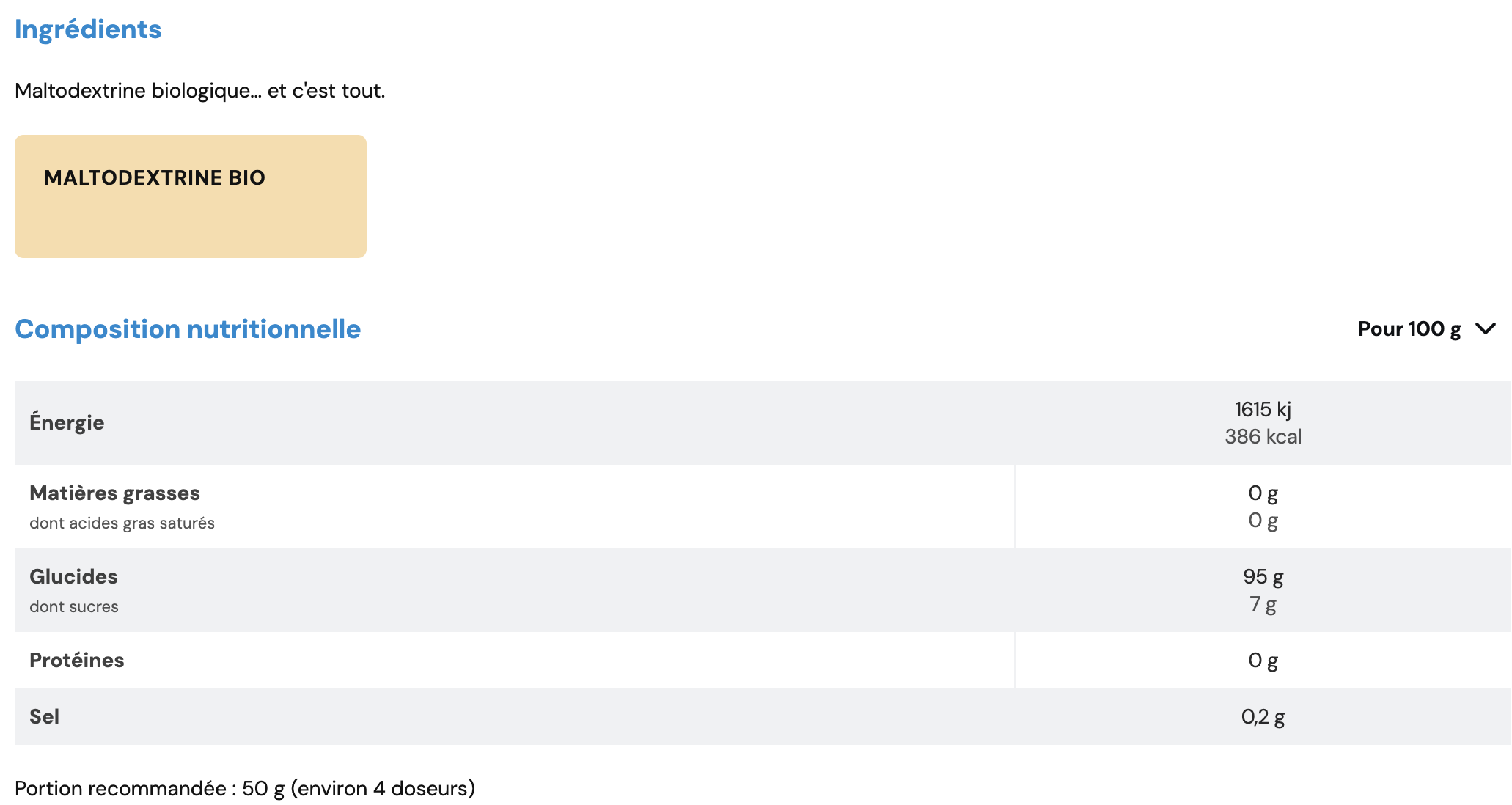 Pour soutenir vos performances, diluer environ 50 g de maltodextrine dans 500 ml d’eau tiède ou froide et boire avant et/ou pendant l’entraînement selon vos besoins énergétiques.