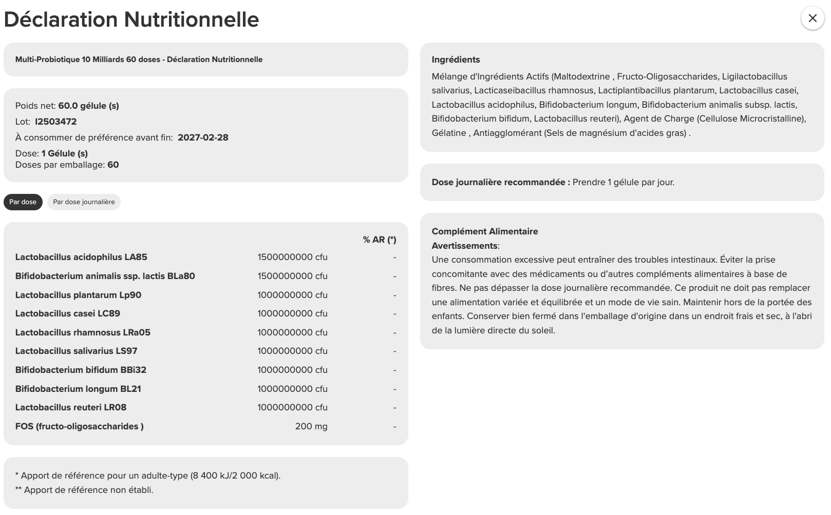 10 milliards de UFC (unités formatrices de colonies) par portion — flore intestinale renforcée