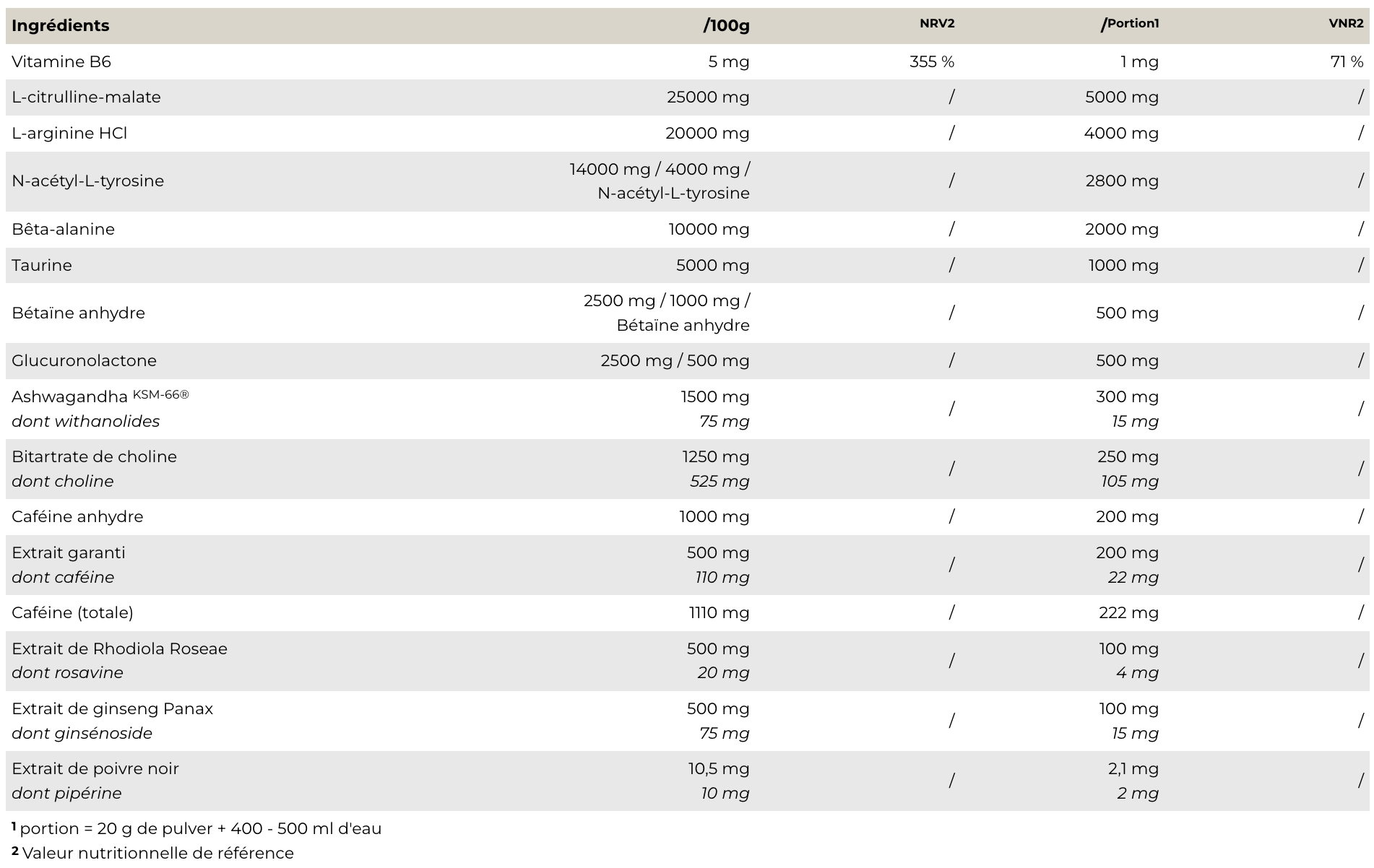 NO JOKES est composé d'ingrédient pour la congestion tel que l'Arginine HCL & Citrulline, pour booster la Carnosine avec la Beta alanine, des substrats de pré-entrainement les plus puissant tel que N-Acétyl L-Tyrosine, Ashwagandha KSM-66, Taurine, Alpha GPC, Bitartre de Choline, caféine, bétaïne, guarana et glucuronolactone. No Jokes contient donc une gamme extrêmement large d'ingrédients actifs, qui a été complétée par d'autres substrats de haute qualité et innovants. Avec la L-théanine, le Panax Ginseng, la Rhodiola Rosea et la vitamine B6, qui sont des ingrédients actifs qui potentialisent les effets des ingrédients et empêchent en même temps le fameux «crash» suite à la consommation du booster. Congestion, concentration, vigilance et performance sans faille - ce n'est pas une blague !
