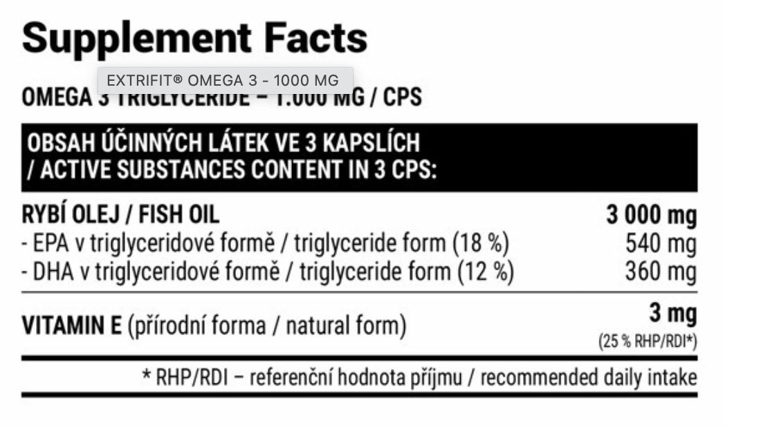 Omega‑3 1000 mg d’Extrifit® est une formule concentrée en acides gras essentiels EPA (180 mg) et DHA (120 mg) issus d’huile de poisson de qualité pharmaceutique. Ces deux oméga‑3 jouent un rôle fondamental dans le maintien de la santé cardiovasculaire, le fonctionnement optimal du cerveau et la réduction des processus inflammatoires, notamment chez les sportifs soumis à un stress oxydatif plus élevé.