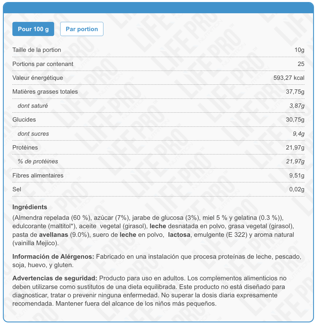 Life Pro Nutrition est une société de supplémentation sportive, avec une longue histoire dans le secteur, qui entend se développer à l'international. L'évolution continue est l'un des objectifs de la marque. Chaque jour, ils travaillent pour atteindre la plus haute qualité, développer de nouveaux produits, afin que les avantages obtenus puissent être utilisés par tous. Life Pro Nutrition a été créé par des sportifs et des professionnels scientifiques, dans le but de proposer des compléments et d'atteindre 100% d'efficacité sous deux conditions non négociables : sécurité pour la santé et confiance pour les consommateurs les plus exigeants. L'aspect qualitatif n'est pas négociable, ils utilisent donc leur expérience dans l'industrie pour travailler avec les experts les plus importants dans le domaine de la nutrition sportive en Europe. Tous leurs produits ont été formulés et développés selon des preuves scientifiques.