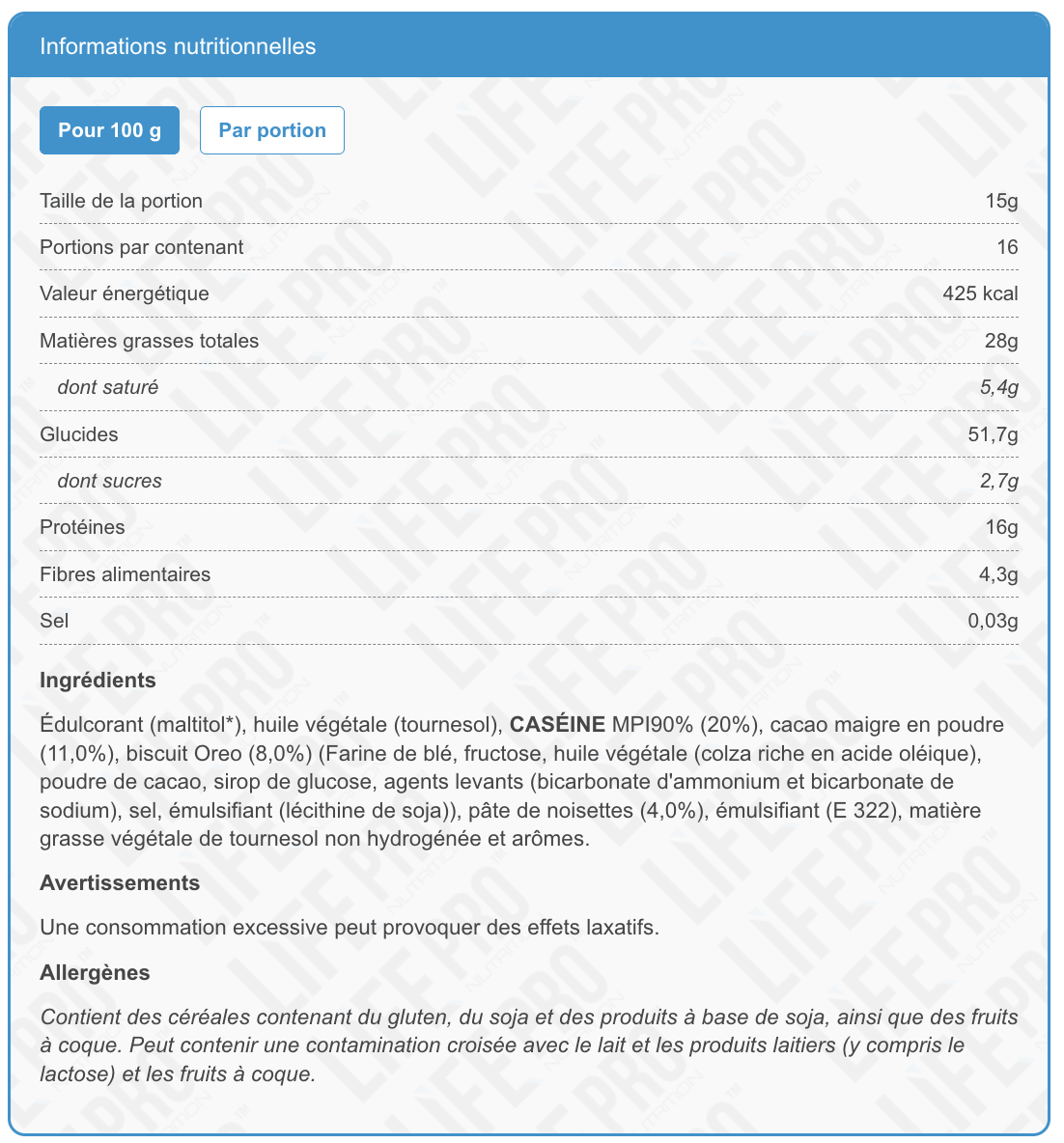 Elle est formulée sans sucres ajoutés et avec des ingrédients soigneusement sélectionnés pour proposer une texture onctueuse et un goût intense de chocolat & cookies. Elle s’intègre parfaitement dans les plaisirs “fit” (tartines, pancakes, yaourts) sans trop de compromis.