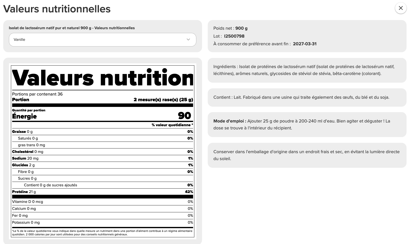 Teneur élevée en protéines (environ 90%), faible en sucres et en graisses