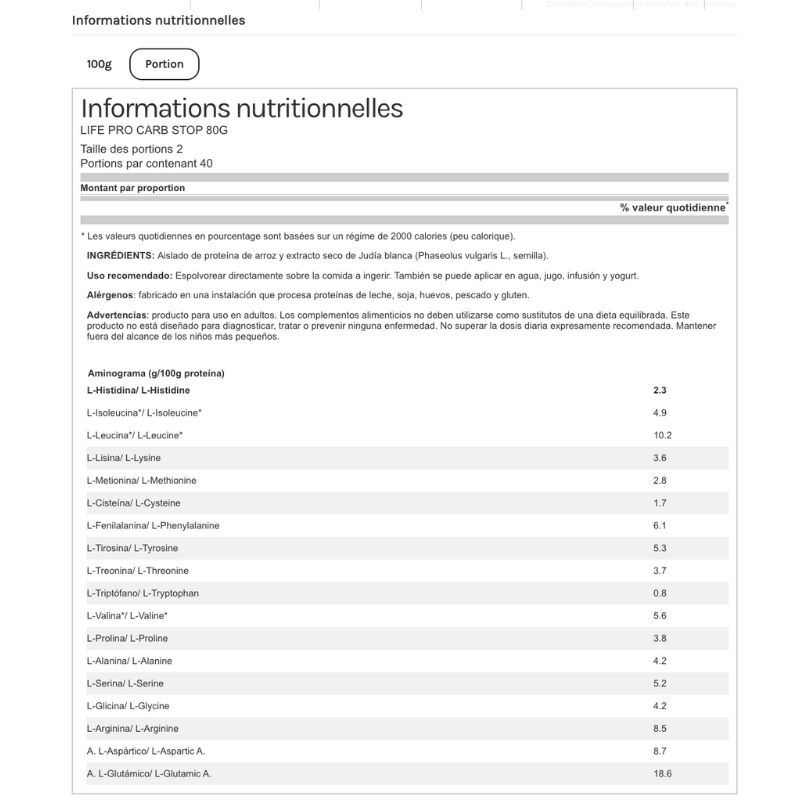 Les bloqueurs de glucides, sont conçus dans le but d’être pris avec un repas élevé dans ce nutriment, dans des occasions spécifiques, comme des repas très élevés en glucides, des repas libres, des événements ou des repas "cheat meal ». Life Pro Stop Glucide a été élaboré avec de l’extrait de haricot blanc, qui inhibe la production de l’enzyme qui se charge de digérer les glucides et de les convertir en énergie. Il empêche qu’ils soient ensuite absorbés. Une autre fonction de ce produit est également d’éviter les pics d’insuline.