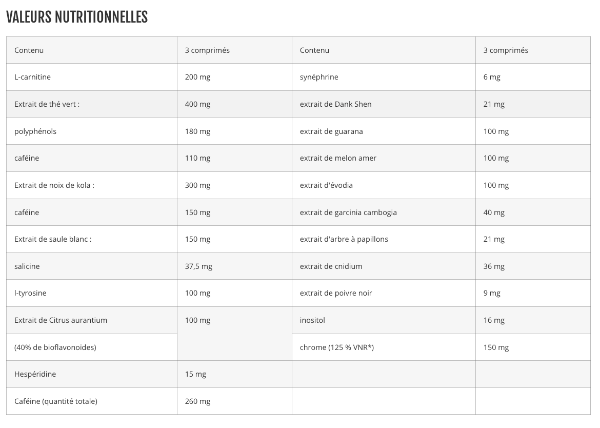 Contient de la caféine, du gingembre, du thé vert et du café vert