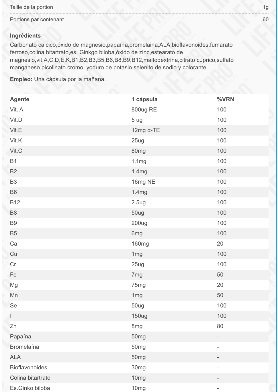 L'un des avantages les plus importants d'une multivitamine comme Life Pro Daily Vits est lié à ses propriétés antioxydantes. Il est idéal pour toutes les personnes qui souhaitent maintenir leur corps dans des conditions optimales et éviter les carences en nutriments.